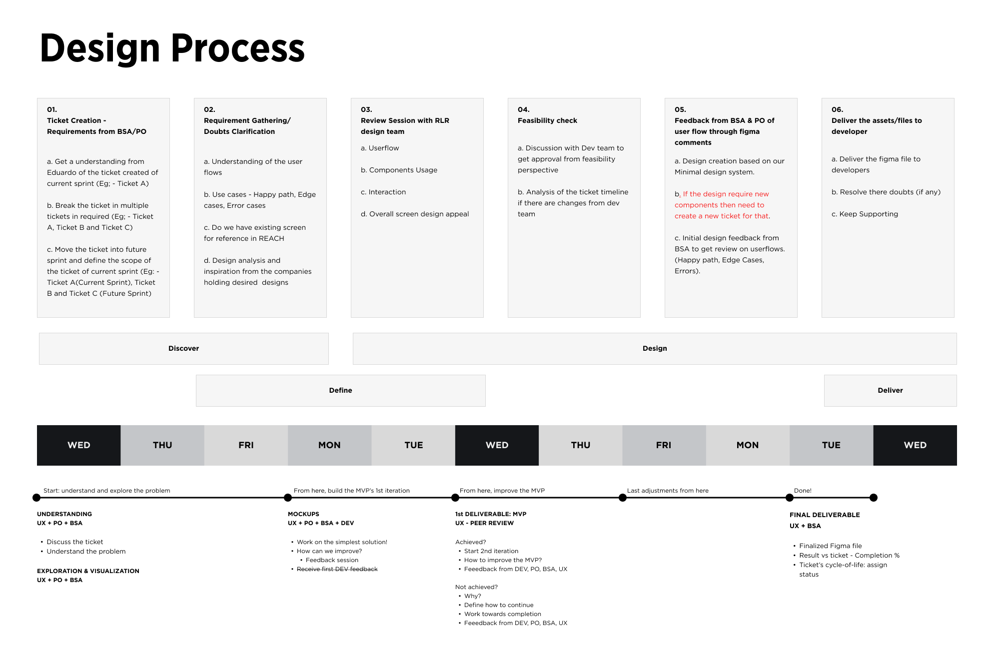 Designing MyRLR meant working within fixed timelines, pre-defined organizational constraints, and a distributed team setup. To support early delivery, the UX process was intentionally adapted to the team’s sprint cadence, prioritizing just-enough discovery, fast iteration, and continuous feedback over linear phases.